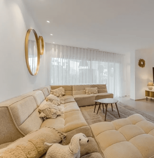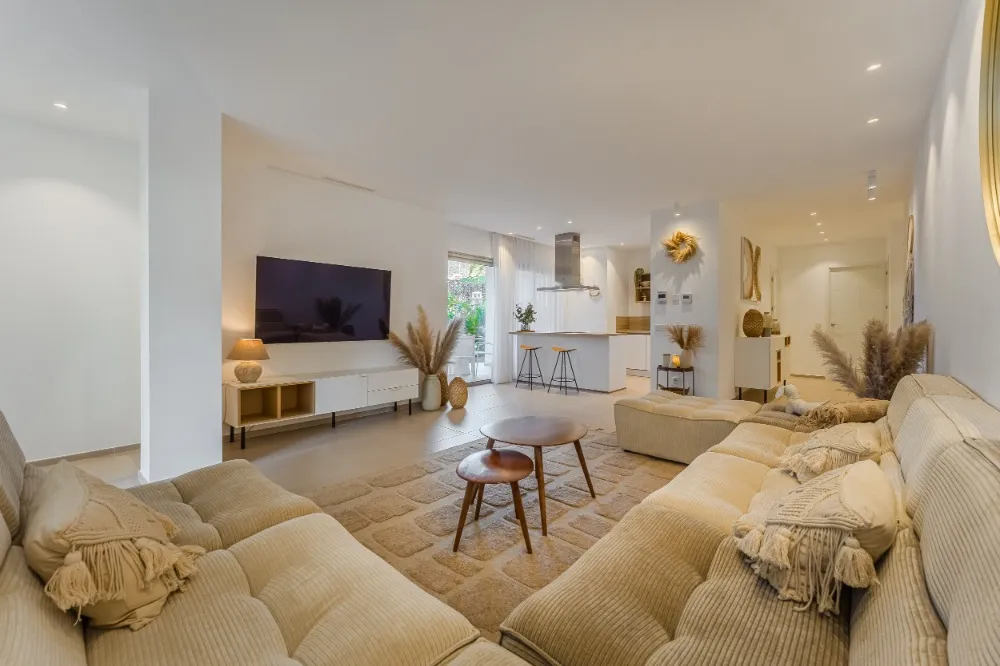 Lichte en ruime living met open keuken, een flatscreen tv met Vlaamse zenders en een tijdloos interieur met natuurlijke en duurzame materialen.